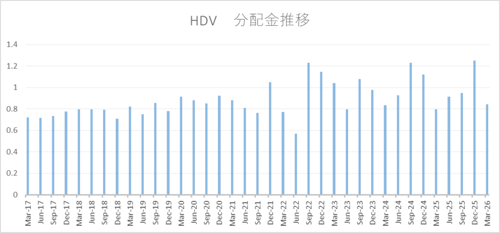 2026年3月のHDVの分配金は$0.842962となり、前年同月と比較すると約6.0%の増配となりました。