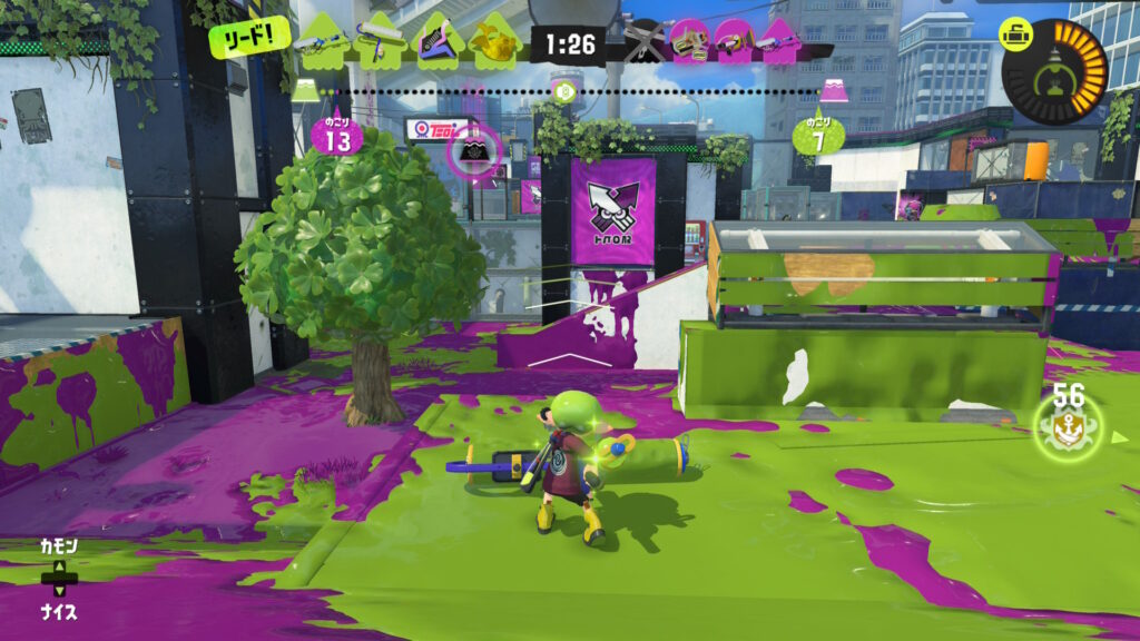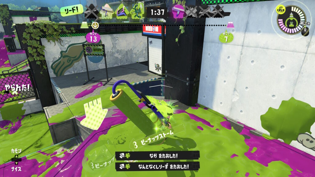 なお、その試合中、塗りポイントを獲得したり、味方をアシストしたりといった行動を積み重ねていると、相手を倒したときにイカフロー状態になりやすくなります。